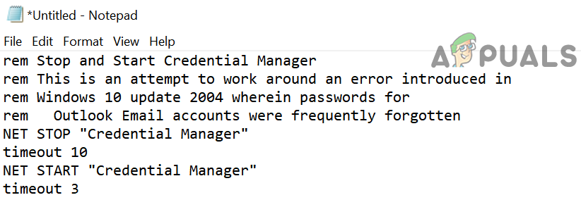 rem Stop and Start Credential Manager rem This is an attempt to work around an error introduced in rem Windows 10 update 2004 wherein passwords for rem Outlook Email accounts were frequently forgotten NET STOP "Credential Manager" timeout 10 NET START "Credential Manager" timeout 3