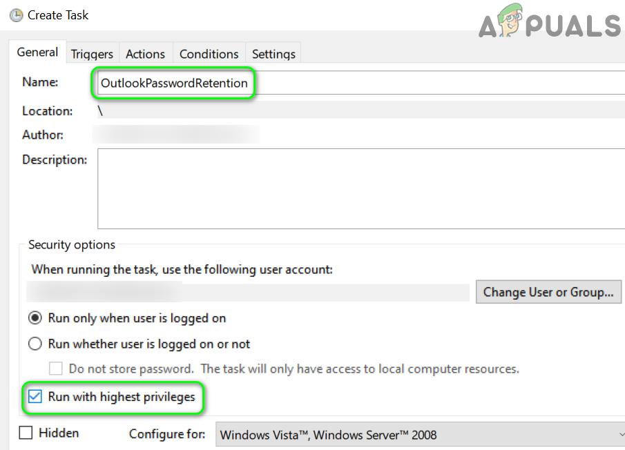 Create Task in the Task Scheduler - Name the task (e.g., OutlookPasswordFix) in the General tab and enable Run with Highest Privileges.