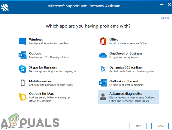 - Click on Advanced Diagnostics-Outlook to download SaRA.
