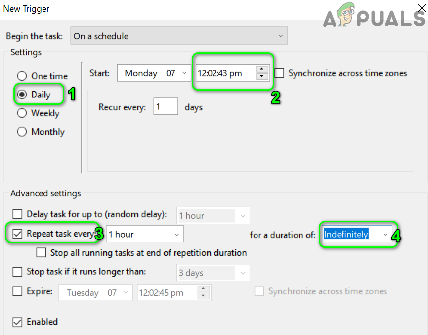 Create a New Trigger for the Task - Check “Repeat Task every 1 Hour” and set “For a Duration of” to Indefinitely, then click OK.