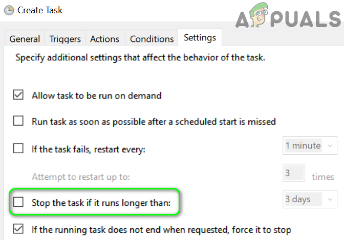 Uncheck the Option of Stop the Task if it Runs Longer than - Close the Task Scheduler, wait ten minutes, and reboot your PC.