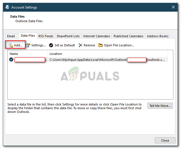- You will have to remove your account first and then add it again. However, to do this, first you will have to create a new data file. Switch to the Data Files tab and then click Add.