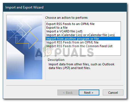 Outlook Import and Export Options - On the wizard, select ‘Import from another program or file’ and then click Next.