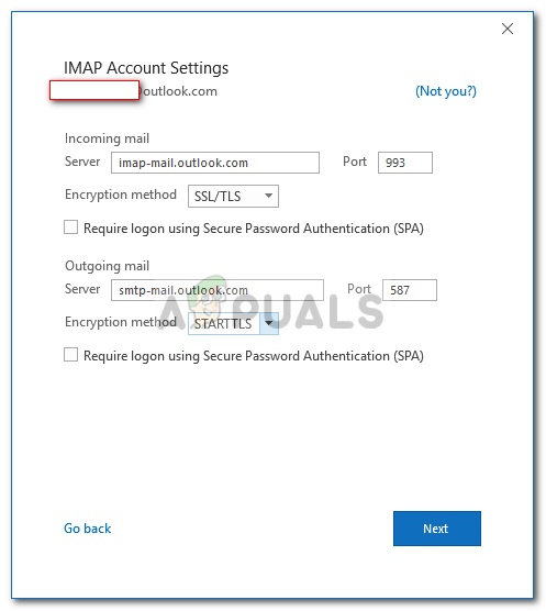 - In the outgoing server box, add smtp-mail.outlook.com and change the port to 587. Set the Encryption type to STARTTLS.