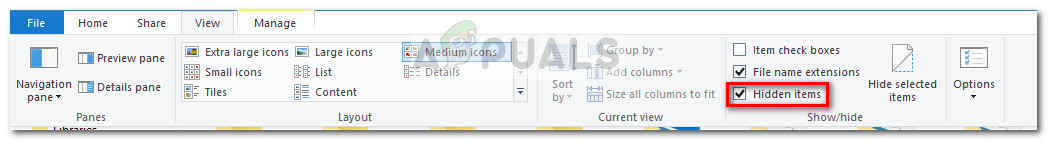 - Open File Explorer and click on the View tab (in the top ribbon). Then, make sure that the checkbox associated with Hidden items is checked.