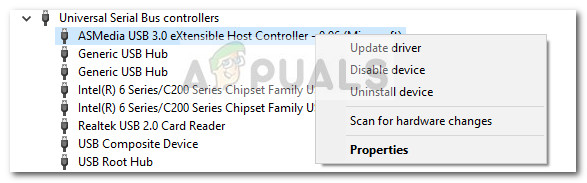 Some users have managed to resolve this issue by updating the USB Controllers drivers. This is all done through Device Manager, but you might have to resort to uninstalling the Host Controller and let WU (Windows Update) reinstall the drivers if the first tactic fails.
