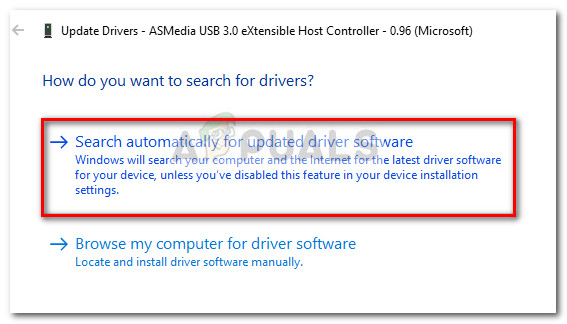 - At the next screen, click on Search automatically for updated driver software and wait for the process to complete.