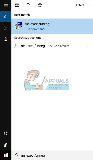 - Press Windows + S, type “msiexec /unreg” in the dialogue box and Run the command as shown below (Press Enter to run the command). Windows Installer will now be unregistered from your system