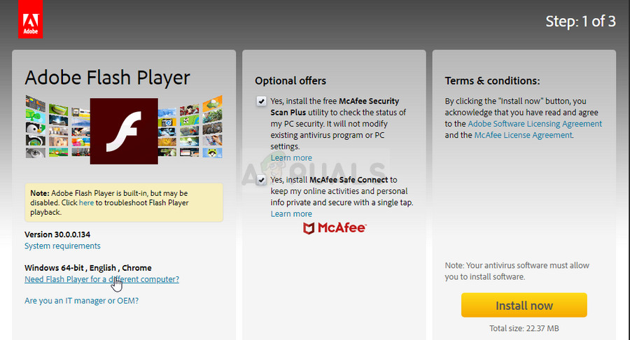 - Run the file you have just downloaded from the Downloads folder on your computer, wait for installation files to download completely, and follow the instructions on-screen in order to proceed and install the Flash Player. Restart your computer afterwards and check to see if the error still appears.