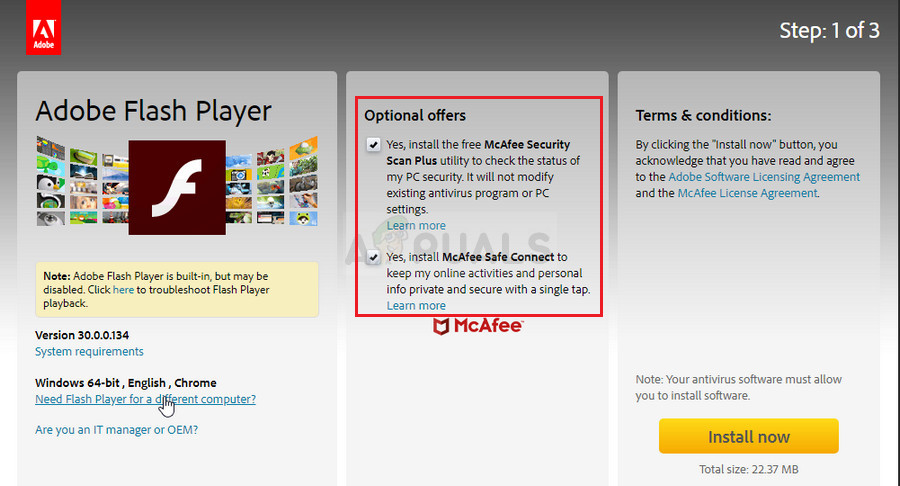 - Make sure you disable the optional offers at the middle of the browser window which would install McAfee tools on your Pc and click the Download now button.