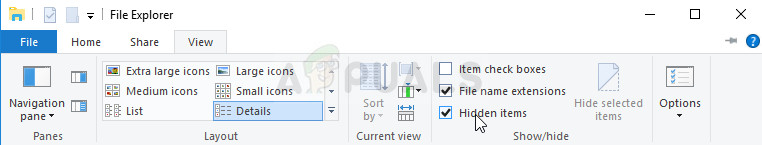 - Click on the “View” tab on File Explorer’s menu and click on the “Hidden items” checkbox in the Show/hide section. File Explorer will show the hidden files and will remember this option until you change it again.