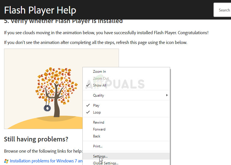 - The quickest way to disable it is by using a Flash animation on their official Help page. Open this link and scroll down to the tree animation. Make sure you right-click on it and lick on the Settings option.