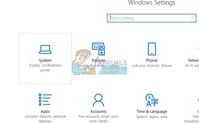- Press Windows + S, type “settings” in the dialogue box and open the application. Select the sub-category “System”.