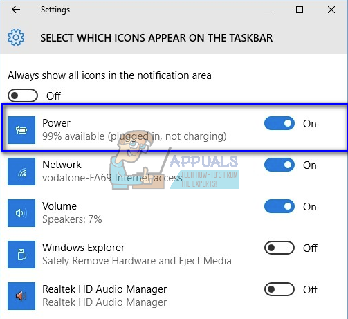 - Make sure that the “Power” option is checked. Now we will check if it is enabled to show in the taskbar. Go back and select “Select which icons appear on the taskbar”.