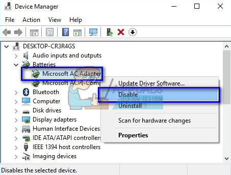 - Expand the “Batteries” section, right-click on “Microsoft AC Adapter” and click on Disable. Do the same for “Microsoft ACPI-Compliant Control Method Battery”.