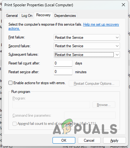 Changing Print Spooler Recovery Actions - Once you have done that, click “Apply” and “OK.” Check if the error message disappears with this action.