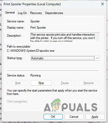Print Spooler Service Properties - Click “Apply,” and then hit “OK.