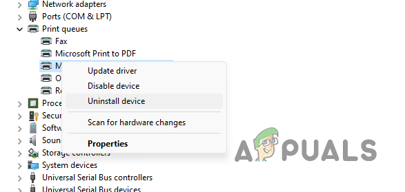 Device Manager - From the drop-down list, locate your printer and right-click on it. Click on the ‘Uninstall Device‘ option.