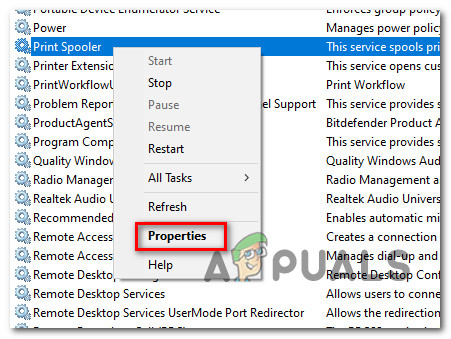 - Once you finally seee the Print Spooler service, right-click on it and then click on Properties from the newly appeared context menu.