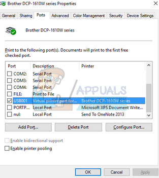 - Navigate to the ‘ports’ Navigate through the list of all the ports available and tick the checkbox where your printer is listed. In this case, “Brother DCP-1610W series” is listed in USB001. Make sure it is checked. After making the necessary changes reboot your computer and check if the problem got solved.