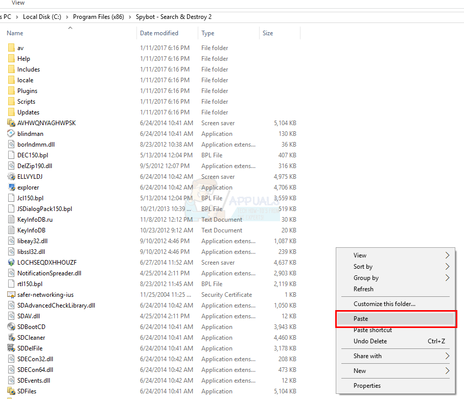 - Right-click and select ‘Paste‘ in the ‘Spybot – Search & Destroy 2’ folder.