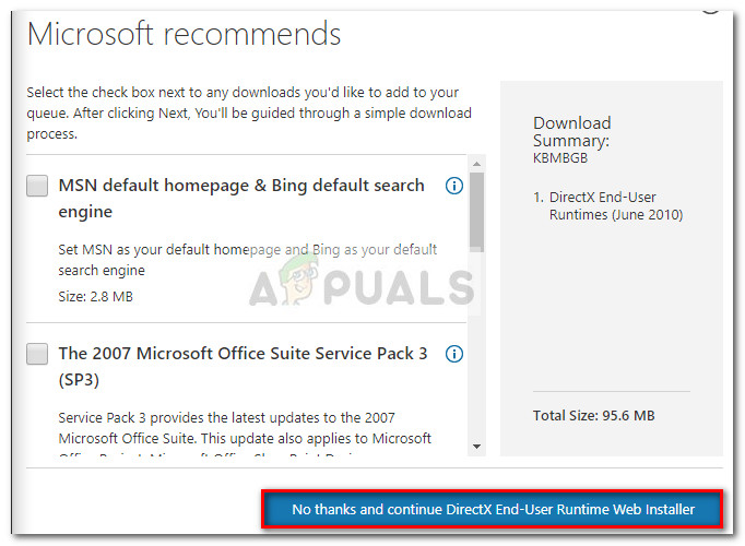 - Uncheck the boxes associated with Microsoft’s recommendations and click the No thanks and continue DirectX End-User Runtime Web Installer button.