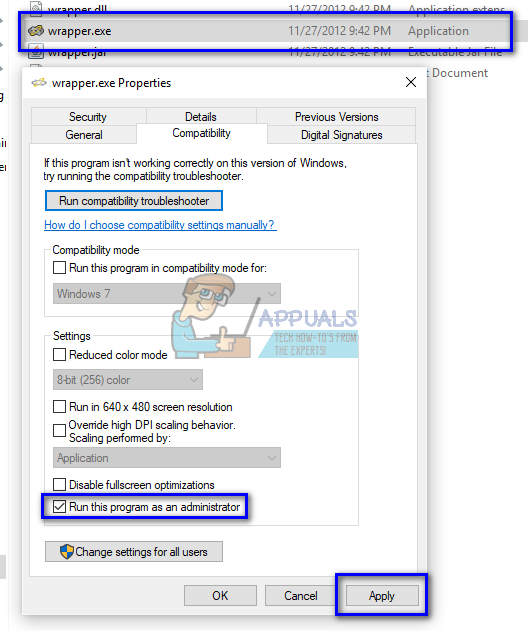 Right-click on “javaw.exe” and click Properties. Now click on Compatibility tab and check the box “Run as administrator”.