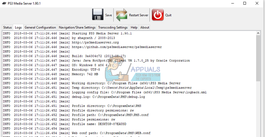 - Launch PS3 Media Server and click on the “Logs” tab. You are to search for the string “Created Socket:” in your log. If the log is lengthy and proving to be troublesome, you can copy it (Ctrl + C), paste it in Notepad (Ctrl + V), and search for the string with ease.
