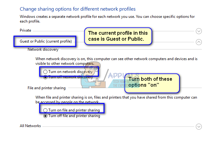 - See which type of network is your current profile. Make sure both of these options are toggled: “Turn on network discovery” and “Turn on file and printer sharing”. They are by default disabled in Guest or Public profiles.