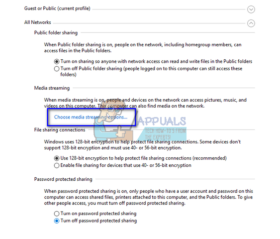 - After making the necessary changes to all the profiles, expand “All Networks” and click “Choose media streaming options…”.