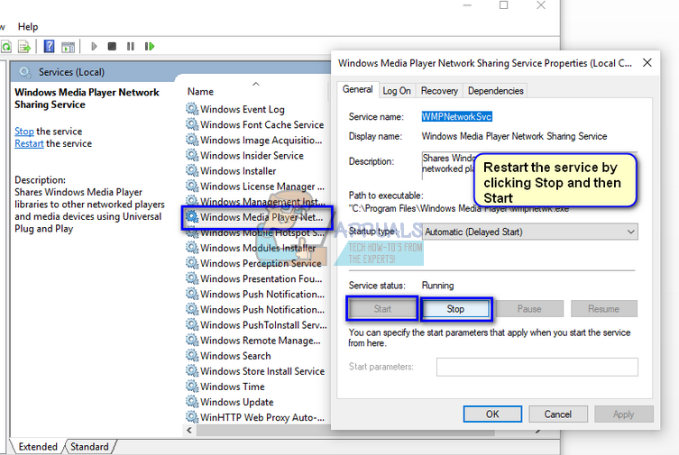 The main service responsible for sharing media across two devices is “Windows Media Network Sharing Service”. It is started automatically once you enable the media server on your computer. If both the above methods don’t seem to do the trick, you can try restarting the service and see if it produces any luck. Do note that you might require an administrator account to follow this solution.