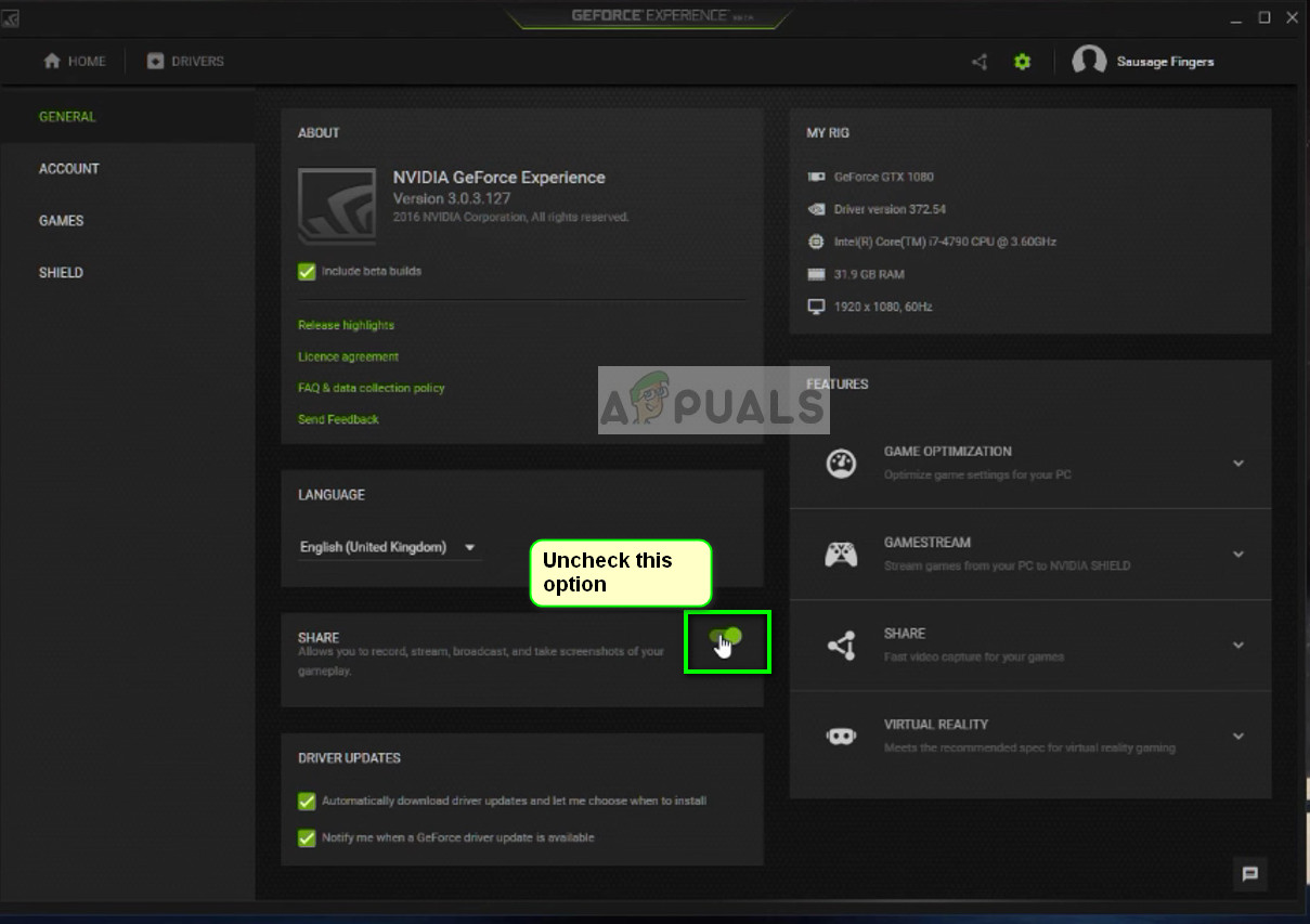 - Navigate to the ‘General’ tab using the navigation pane present on the left side of the screen. Turn “Share” off by clicking the switch in front of it (ShadowPlay is also known as Share). Press Apply to save changes and exit.