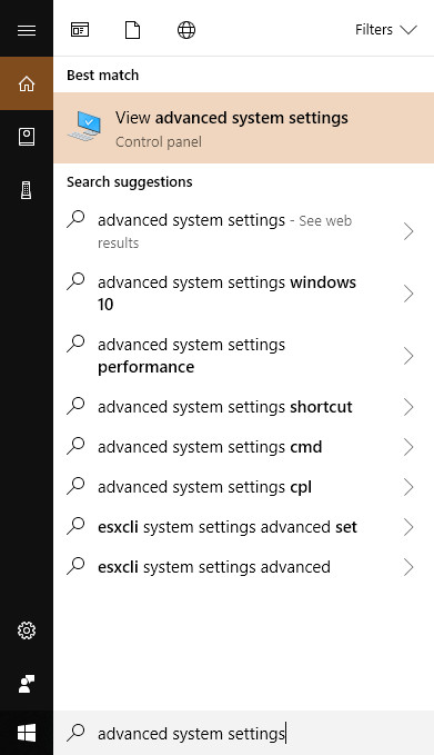 - Press Windows + S, type “advanced system settings” in the dialogue box and open the applications which return in the result.