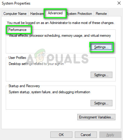 - Select the Advanced tab, and click on Settings under the subheading of Performance.
