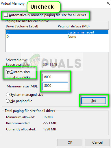 - Uncheck the option “Automatically manage paging file size for all drives” and click on the Custom size and both values to 8000. Now click Set after making the changes.