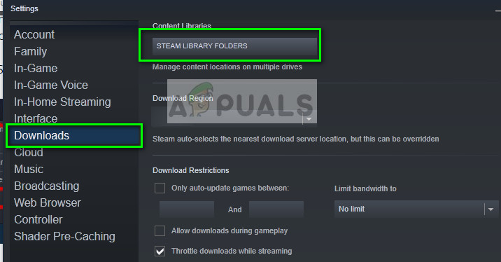 - Select the Downloads tab using the left navigation pane and click on Steam Library Folders.