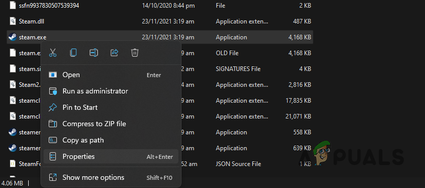 - Right click on the steam.exe file and from the drop down menu, click Properties.