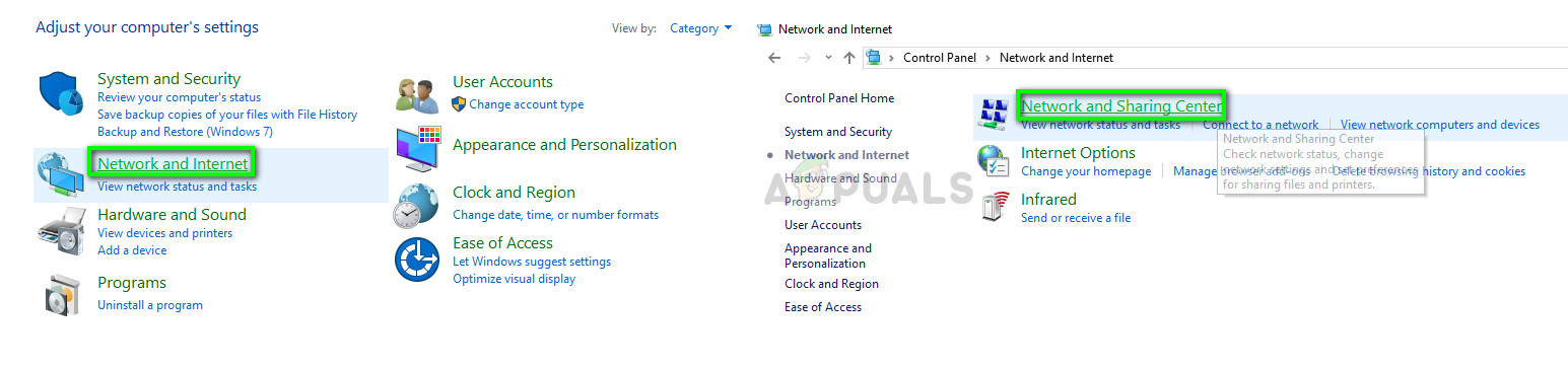 - Once in the control panel, click on Network and Internet and then click on Network and sharing center.