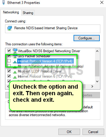- Uncheck the option Internet Protocol Version 4. Press OK and exit the settings.