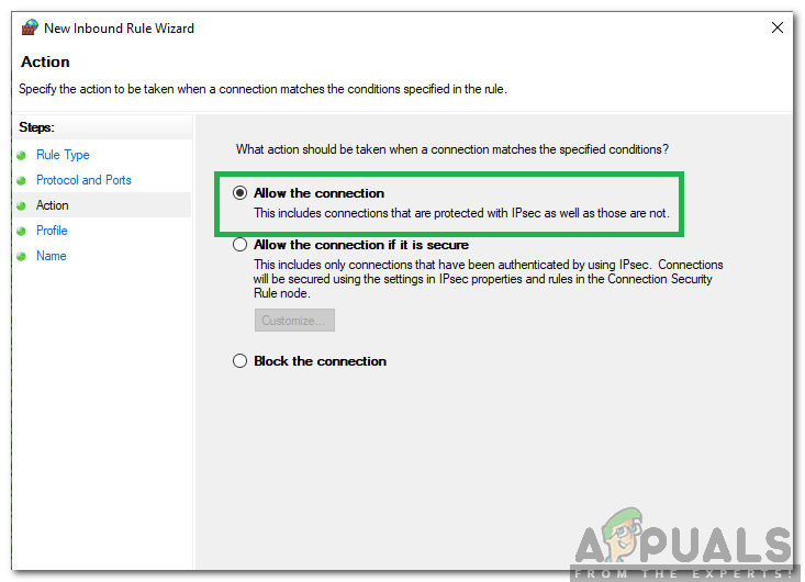 - In the next window, make sure that the “Allow the Connection” option is selected and click on “Next”.