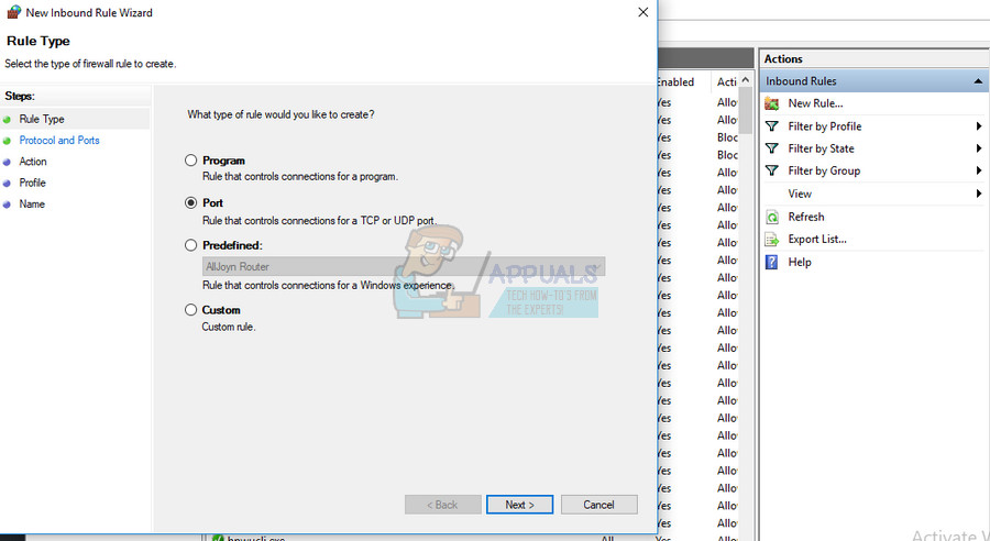 - Right click on Inbound Rules and click on New Rule. Under the Rule type section, select Port.