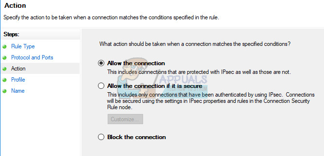 - Select the Allow the connection radio button in the next window and click Next.