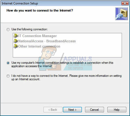 - Click to select the option for “Use my computer’s Internet connection settings to establish a connection when this application accesses the Internet”.