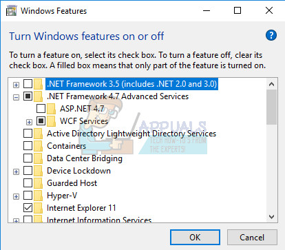 - If the check box next to .NET Framework 4.5 or 4.7 is not enabled, enable it by clicking the box. Click OK to close the Windows Feature window and reboot the computer.