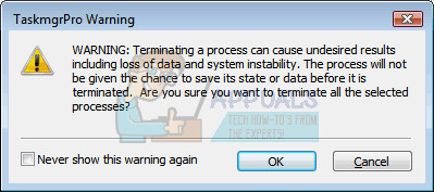 - Click Yes to the message which is going to be displayed: “WARNING: Terminating a process can cause undesired results including loss of data and system instability….”
