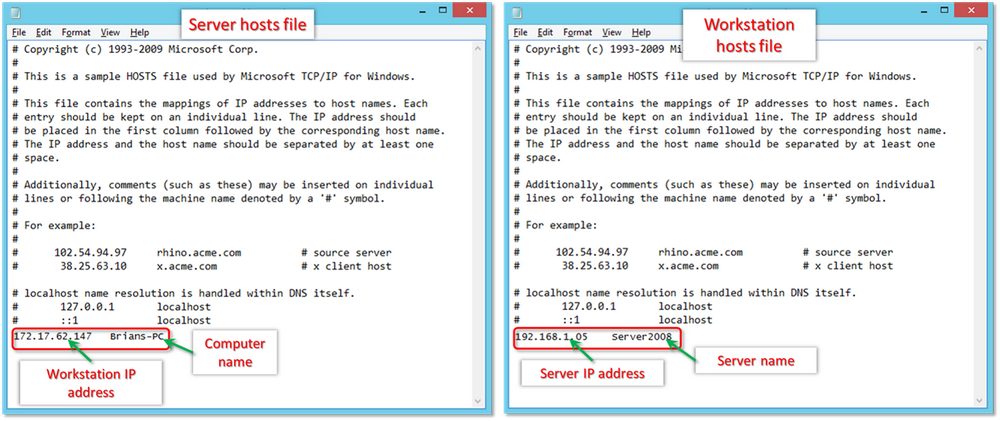 - Enter the IP address and type in the Computer Name (Server- will have workstation IP and computer name. Workstation- will have Server IP and computer name). While entering this information, use the Tab key instead of the space bar to separate IP address and computer name.