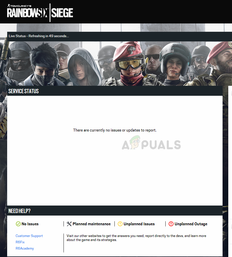 You can navigate to Tom Clancy’s Rainbow Six Siege – Service Status website and check the server status. As you can see in the image above, there are icons for the server status. If there is anything wrong with the server, wait it out until it is fixed.