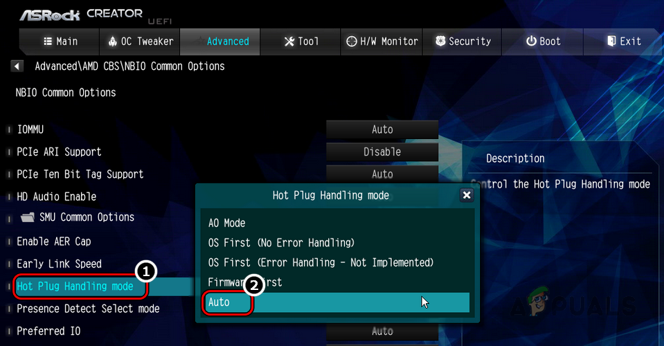 Set the Hot Plug Handling Mode to Auto in the System’s BIOS - Then save the changes made and boot your system into Windows to check if the reset to device issue is resolved.