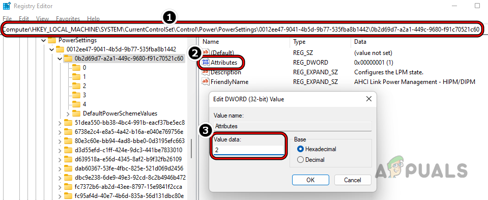 Set the Value to Attributes to 2 in the Power Settings Registry Key - Then navigate to the following path: