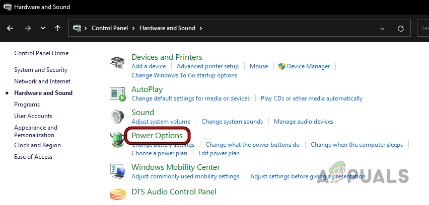 Open Hardware and Sound in the System’s Control Panel - Then select Power Options.
